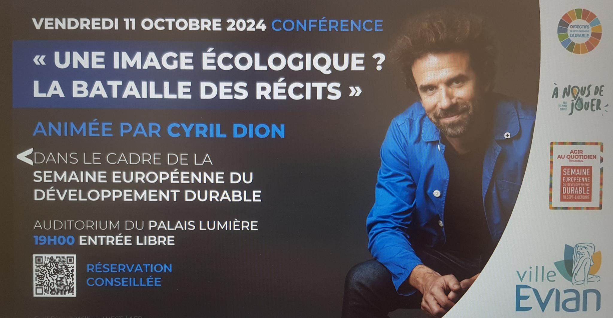 Ce vendredi 11 octobre, j’ai eu le plaisir d’assister à Évian à une conférence captivante de Cyril Dion, intitulée « Une image écologique ? La bataille des récits ». Écrivain, réalisateur et militant écologiste, Cyril Dion est reconnu pour sa capacité à aborder les enjeux environnementaux de manière engageante et inspirante.