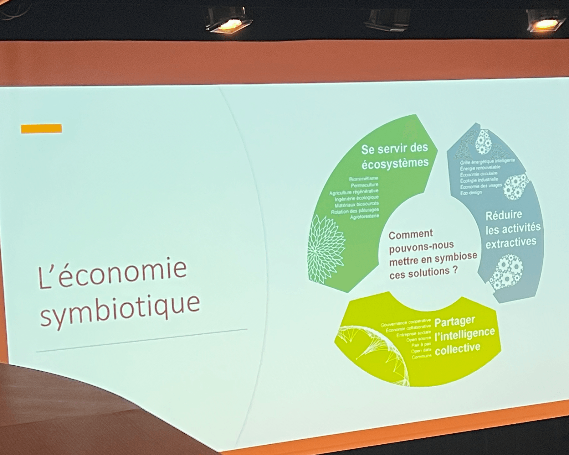 Cyril Dion a également évoqué le concept d’économie symbiotique, un modèle économique alternatif fondé sur la coopération entre les systèmes vivants et les activités humaines. Contrairement à l’économie traditionnelle, qui exploite les ressources naturelles de manière linéaire et souvent destructrice, l’économie symbiotique propose une approche inspirée des écosystèmes naturels. Elle cherche à intégrer les activités humaines dans les cycles de la nature, de façon à ce que chaque acteur tire parti des autres tout en les enrichissant. Ce modèle s’aligne parfaitement avec l’idée de transformer nos récits pour qu’ils promeuvent des pratiques respectueuses et durables, en favorisant une économie régénératrice où la croissance ne se fait pas au détriment de l’environnement, mais en symbiose avec lui.
